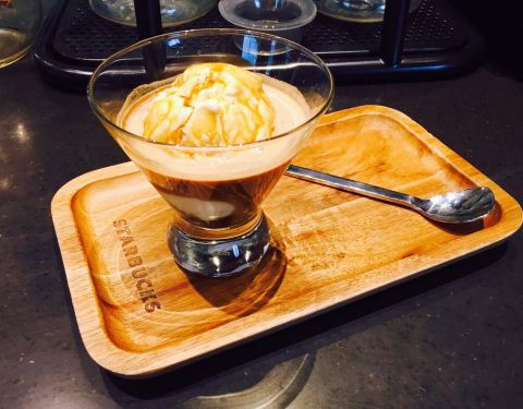 这家店就在来福士二楼,人非常多,中午12点去的,竟然没空桌了,只能坐在吧台,还好排队的人不多,很快就能拿到饮料。 在阿馥奇朵和夏柚肯亚里纠结了下,还是选了阿馥奇朵。45元的价格,略贵,不过味道是很赞的,清冽微苦的咖啡中和了冰淇淋的甜腻,味道恰到好处。 其实楼下门外,还有家星巴克,人比较少,有空位,不过没有阿馥奇朵。