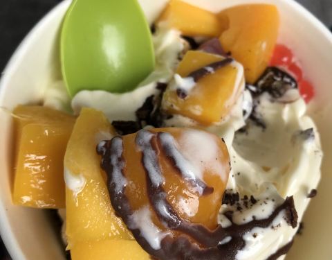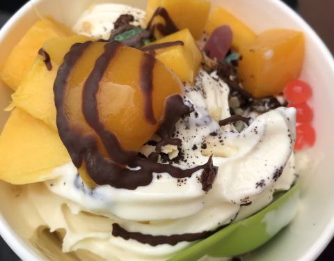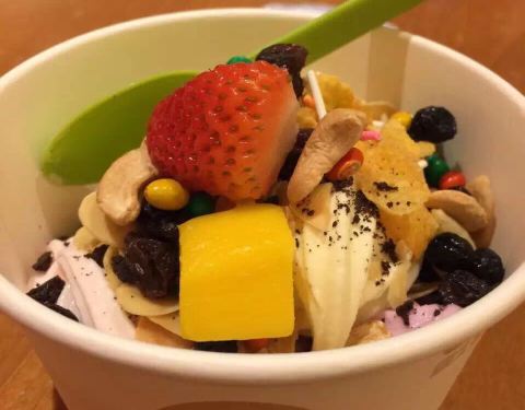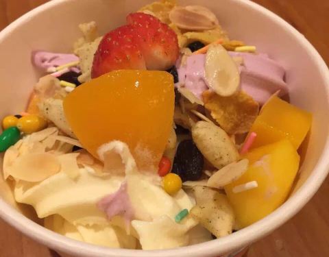 看著不覺得贵,挤了一黑冰淇淋,再加上一些些配料,要價60多元,酸奶口味,本人不喜歡,小孩吃的津津有味