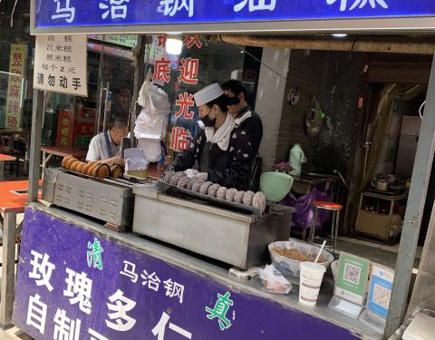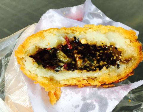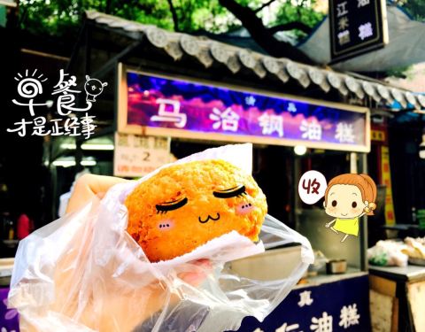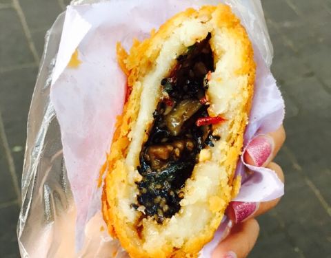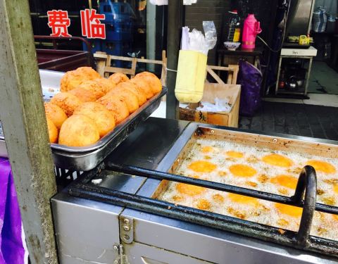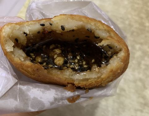 西安之旅 (因为一颗吃货的心)起得太早... 小本本上记录的想去的店都没开始营业, 走了一圈看到这家开啦~ 想要个黑米糕的, 老板说只有这一种...好嘛.... 两元一个~其实还蛮大个的... 五仁儿馅儿~能看到中间一块儿核桃仁儿~ 甜甜蜜蜜的味道~ 刚炸出来没多久,小心馅儿很烫呀~ 吃完一整个其实有点甜腻... 然而吃完我就继续向甑糕出发了 【吃货的执着...】 回想起来也是有点齁