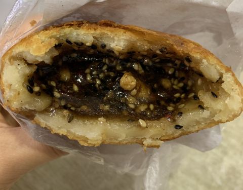 西安之旅 (因为一颗吃货的心)起得太早... 小本本上记录的想去的店都没开始营业, 走了一圈看到这家开啦~ 想要个黑米糕的, 老板说只有这一种...好嘛.... 两元一个~其实还蛮大个的... 五仁儿馅儿~能看到中...