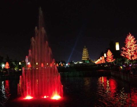 吃在西安的典型代表,大雁塔旁边的天下第一面,尝到了大名鼎鼎的bling bling面,面很筋道,吃完可以到大雁塔广场看音乐喷泉。