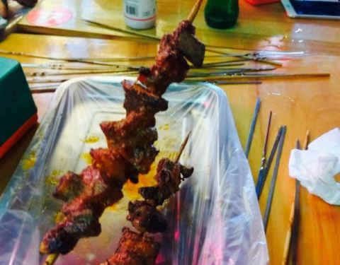坐在隔壁吃小龙虾,胖子专门跑过来买了几串羊肉串。生意超好,三元一串,围了一大堆。还以为是八元一串,实在便宜,比离我家非常近的中海还便宜一元。五大坨肉肉,一坨肥肉,肥肉味道有些怪,其余都没得啥子感觉...