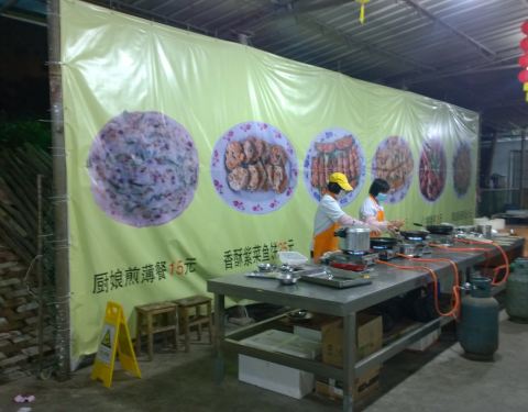 这是位于芳村东塱的一家农庄式大排档,在一个农家大院内,有房间和大厅。大厅是搭起的一个大棚,环境非常简陋。 出品都是农家菜,比较粗糙,价格实惠。 烧鹅 是现点现烧的,皮脆肉嫩,分量很大。 筒骨煲淋莲藕 莲藕很淋,汤很鲜甜。 山楂猪手 猪手很淋很肥厚,酸甜可口。 煎酿三宝 有辣椒、茄子、苦瓜,酿了肥瘦适中的猪肉,煎的很香。 服务员态度一般,基本没有服务。