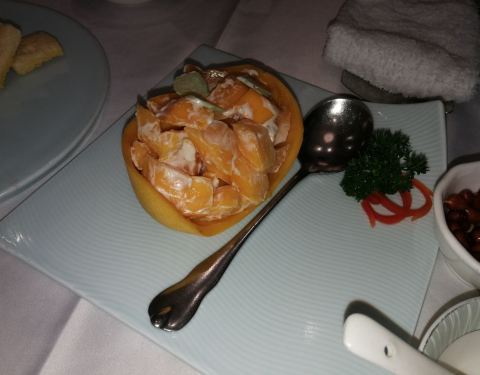带了朋友过来尝尝嘉定的本帮特色,自然是选兰轩,停车也方便免费,就是位置不太多,不过店家都会帮你安排好停车,很有秩序。首先上座会有餐前水果,算在餐位费里。因为他们家的菜量蛮大的,点了他们家的鲍鱼捞饭,芒果色拉,鹅肝,牛仔骨等味道还不错,价格也还算可以吧。