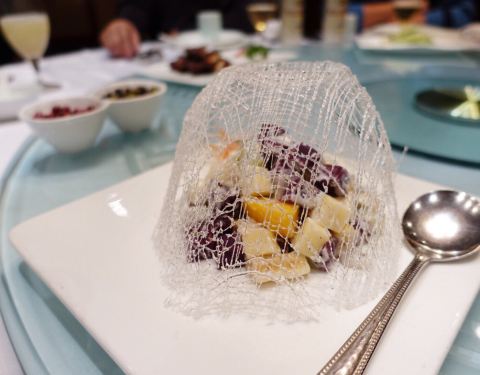 再次来到这家店,先是电话预订并要求留了烤鸭,烤鸭还算可以。冷菜还是非常好的:捞拌凤爪预制的料绝对是有水准;鹅肝服务员特别提醒要姜片和面包片与鹅肝夹在一起吃,果然是不错。热菜吗油爆虾算是一般吧,蟹粉...