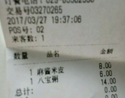 一,口味: 米皮:5元。味道很好,只是凉皮比以前的更细了,菜是豆芽与菠菜,辣子油有芝麻。量尚可。 麻酱凉皮:8元。凉皮依旧很细,只是稍微厚一些,麻酱已经是调和过的。另外有面筋,西兰花等。 八宝粥:6元。...