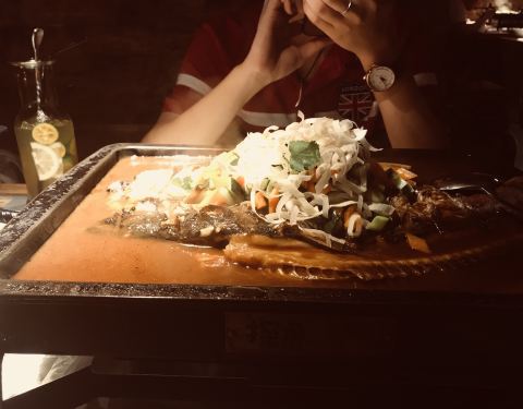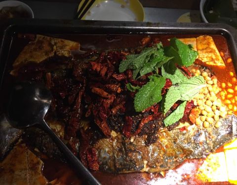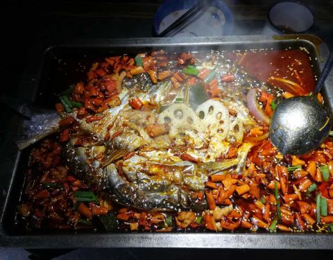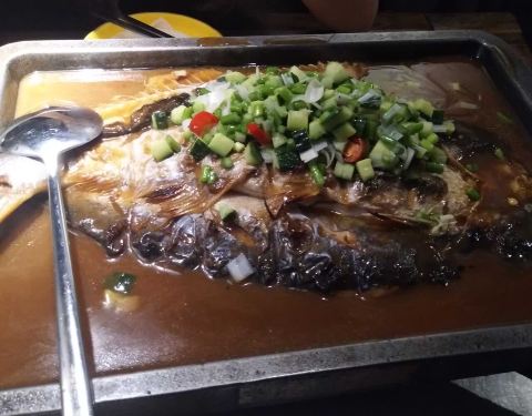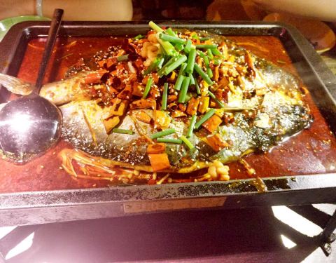 - 招牌烤鱼是每桌必点的,鱼很大一条,没什么骨头,另外点香辣虾也很好吃
