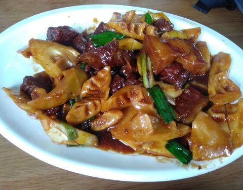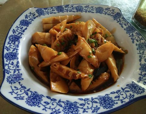 爬好天马山下来,已经1点半了,在山脚下找到了这家饭店,已经过了饭点,店里食客还是很多,门口停满了车,在老板的建议下,点了油焖兰笋,蛋黄锅巴,菱角炒毛豆,海鲜面疙瘩,兰笋是佘山的特产,其它地方很难吃到...