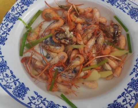 爬好天马山下来,已经1点半了,在山脚下找到了这家饭店,已经过了饭点,店里食客还是很多,门口停满了车,在老板的建议下,点了油焖兰笋,蛋黄锅巴,菱角炒毛豆,海鲜面疙瘩,兰笋是佘山的特产,其它地方很难吃到,鲜嫩可口,一盘笋一会儿就没了,其它的菜也很不错