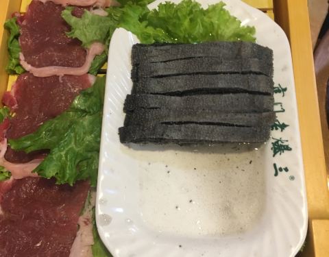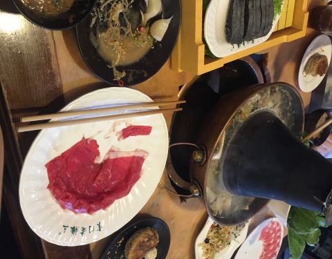 上周末去吃的,在二楼,一个叫“黄海”的包间,店内环境还是不错的,相对于这个地段来说,已经算是档次比较高的了。5个人,四男一女,鸳鸯锅底,点了一堆菜,牛肉,羊肉(这俩都是巨大盘的那个),百叶(不入味,水发的白色的那种),羊宝(不推荐,是切成巨薄的片了),牛脊髓(超爱吃,这家的量还不错。注意别涮的太老了,不然嚼着费劲也不入味了),脑花(猪的,新鲜度还不错。这个涮的时候要用篦子托着,不然锅开了就都冲散了),梭边鱼(论斤要,会先让你看看活着的模样,然后一会就端上来收拾干净切好的段。非常新鲜,鲜美,尤其是在辣汤里涮),牛蛙(论斤要,去皮的,涮辣汤可口),山药,洋芋,粉丝,金针菇(好像还有什么,但是想不起来了,)。酸梅汤免费的,可以无限续,凉菜免费的,自己盛,有海带丝,拌黄豆,拌芹菜,拍黄瓜(比较受欢迎,这菜我们至少得吃了7,8盘)。小料要的芝麻酱的,特别稠,有点咸,会附送一小碟香葱和香菜。不开发票就送饮料。服务很到位,服务生挺有眼力见儿的,味道也挺好吃的,但是影响我下次不去的缘故,是吃完了身上的味道真的太大了。另,被我无意撞见的,服务生会将菜品上摆放的兰花回收再利用。