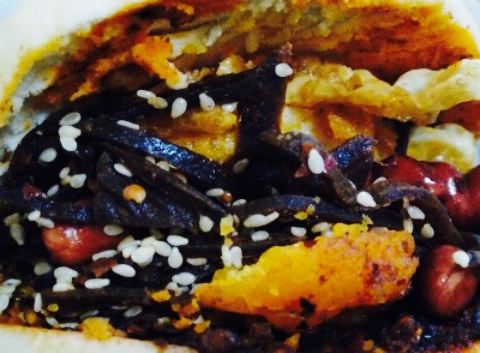 菜蛋夹馍。好想吃好想吃,可是最近总是没有机会去回民街,而且如果去那,肯定会大吃特吃,没有肚子吃这个的。这次这个真是多亏了好友,她要去吃泡馍,我一听马上让他帮我带一个这个,赶快让我解解馋吧。地址就在刘信小炒的对面,ps 。现在刘信也越来越倾向于外地人的口味了,听闺蜜说,他要的多方辣子多放醋,一点都不酸,完全失去了陕西的味道。一个蛋菜夹馍7元。 。一个煎蛋 。一个鸭蛋黄 。一些玫瑰咸菜 。再来一点花生米,多方花生米,脆脆的 。口感更加棒。咸菜是西安特有的玫瑰咸菜,略微有点甜甜的,还有些辣辣的,鸭蛋黄嫌香咸香的,油油的,好美味。说真的,一个吃完还想吃第二个。