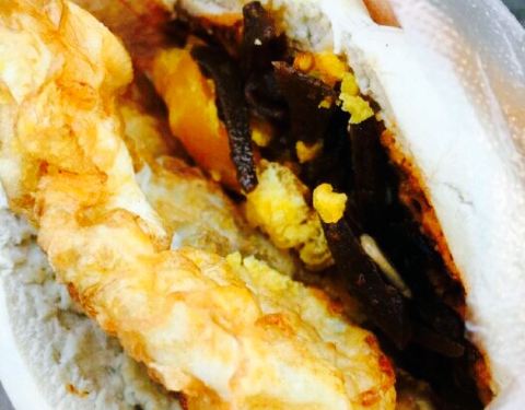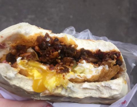 ...连续去买了三次,鸡蛋夹里面香香的,还有果仁和咸菜,最喜欢抹的辣子酱,特别香,还不辣,吃了还想吃