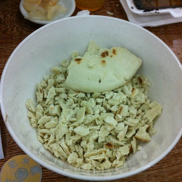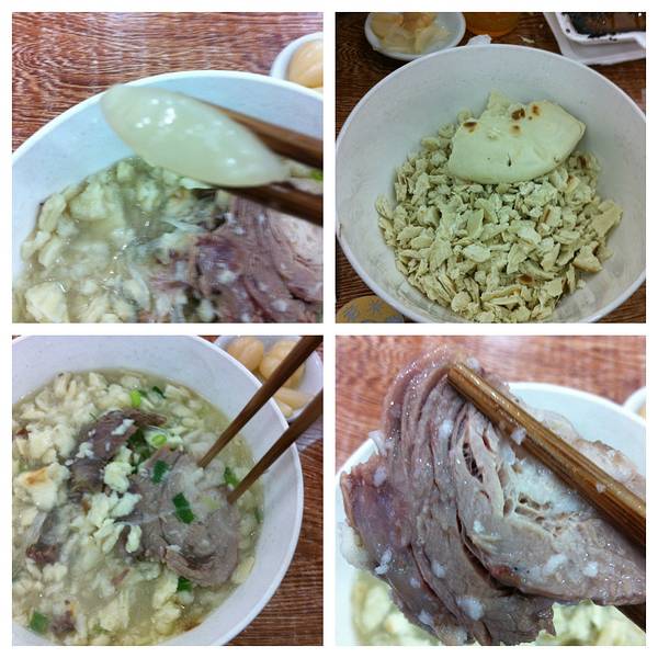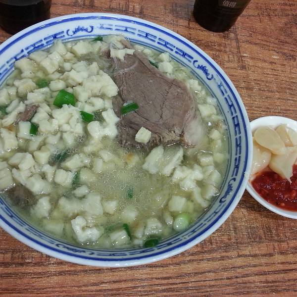 馍是死面儿的白白的而且特别硬 掰一个感觉手都疼 哈哈哈~不过这样吃起来挺有趣儿的羊肉大块且厚 不仅没有膻腥味儿而且肉质很嫩,正宗的羊肉泡馍大概就是是把功夫下在了肉上面吧~