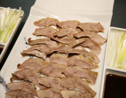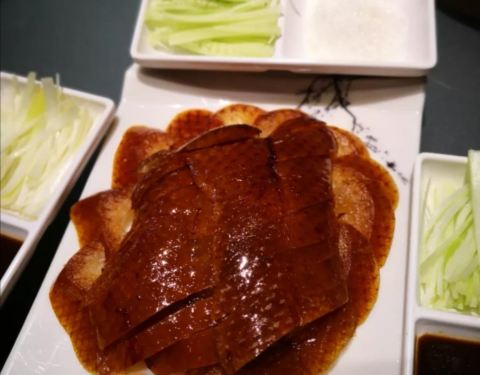 - 片鸭片的很好,鸭皮一盘,脆脆的,鸭肉一盘,香香的,连皮带肉又是一盘,葱丝黄瓜鸭饼和甜面酱都挺满...
