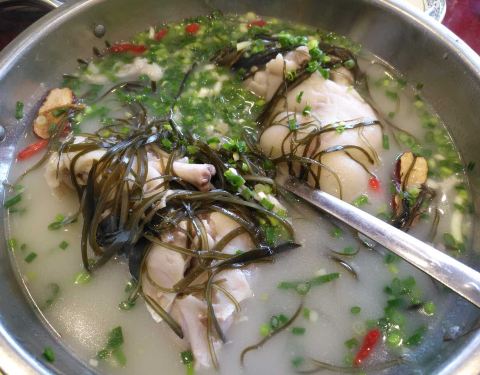 双人餐里我们点了传统的海带丝猪蹄,上来是一碗完整的大猪手炖的汤,现在超市生猪手估计也要20多了吧,所以份量还是货真价实的。猪蹄味道不错,如果能再炖得烂一点就好了,我用筷子都不是很容易把它肢解,一个人直接啃没问题,和人家分就有点麻烦。汤倒是很鲜美,这一碗基本一滴不剩。