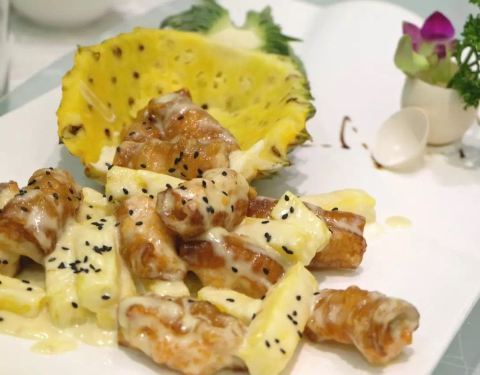 菠萝油条虾是一道很具特色的菜品,将常人意想不到的菠萝、油条、虾结合在一起,采用虾青素较高的斑节...