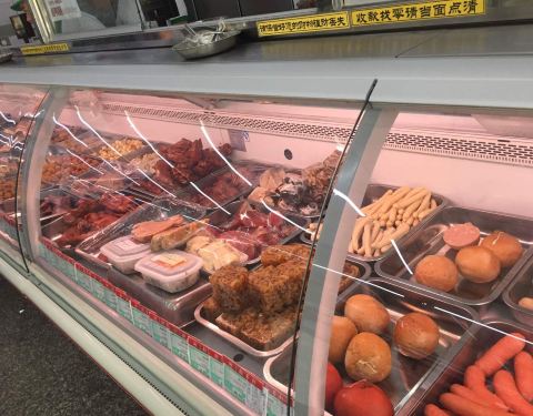 家门口开的,品种齐全,高点,熟食,小菜,豆制品,冷鲜,都有。昨天买了鸡肉串羊肉串,好吃,就是这个味道~哦