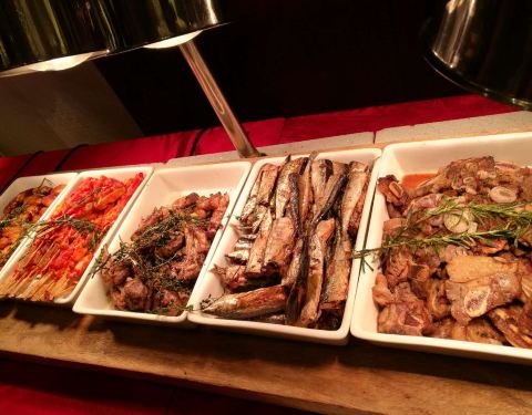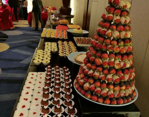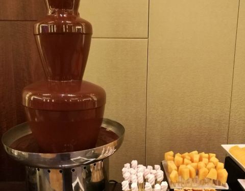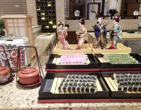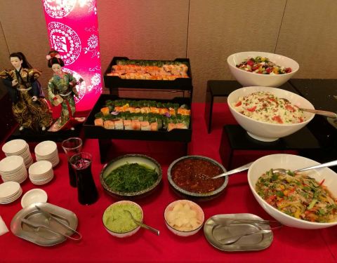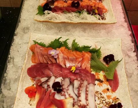 年夜饭订在这里吃,很不错,环境优雅,价格比平时要贵一倍,300一人,食材新鲜,味道也超棒。主要整个场地的两边各有一个超大屏幕直播春晚。 羊排,牛排,烤秋刀鱼都很不错。量也充足。 海鲜类的有蟹脚,青口贝,扇贝,甜虾,章鱼,三文鱼,金枪鱼,北贝贝等,个头很大又新鲜,切片厚实。 相对来说寿司的品种最少,但味道不错。 热菜类的叉烧、烤鸡、烤鸭等给人印象最深刻,切的厚实又保留好汁水。 点心有南瓜饼,春卷和饺子,南方人过年也尝尝北方的饺子,肉馅的,不错。 甜品区域非常丰富,全家都感觉甜品最出色,草莓塔美观,味道倒一般,每一颗红红的大个头的草莓外裹上了浓厚的巧克力外衣,但是草莓有些硬啦,还有些冰冰的。其他的甜品都非常可口,特别是芝士蛋糕十分的浓郁,巧克力蛋糕,芒果慕斯,布丁等,还有一款上面是酸奶底下是芝士蛋糕的甜品很有特色。 巧克力瀑布区域,是甜蜜蜜的棉花糖、华夫和蜜瓜。