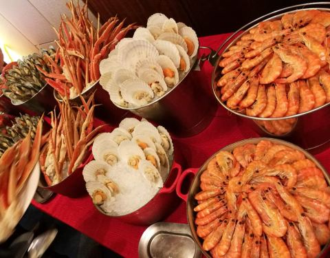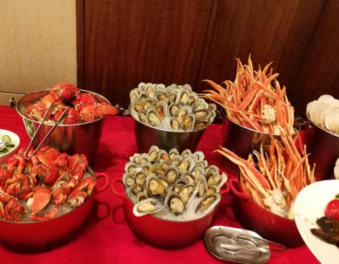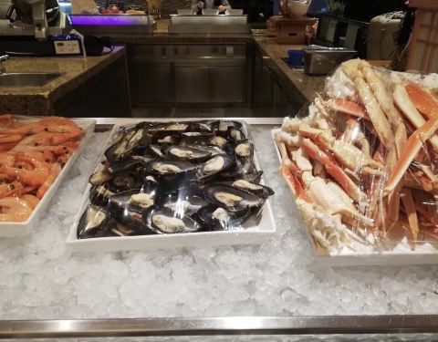 年夜饭订在这里吃,很不错,环境优雅,价格比平时要贵一倍,300一人,食材新鲜,味道也超棒。主要整个场地的两边各有一个超大屏幕直播春晚。 羊排,牛排,烤秋刀鱼都很不错。量也充足。 海鲜类的有蟹脚,青口贝,...年夜饭订在这里吃,很不错,环境优雅,价格比平时要贵一倍,300一人,食材新鲜,味道也超棒。主要整个场地的两边各有一个超大屏幕直播春晚。 羊排,牛排,烤秋刀鱼都很不错。量也充足。 海鲜类的有蟹脚,青口贝,扇贝,甜虾,章鱼,三文鱼,金枪鱼,北贝贝等,个头很大又新鲜,切片厚实。 相对来说寿司的品种最少,但味道不错。 热菜类的叉烧、烤鸡、烤鸭等给人印象最深刻,切的厚实又保留好汁水。 点心有南瓜饼,春卷和饺子,南方人过年也尝尝北方的饺子,肉馅的,不错。 甜品区域非常丰富,全家都感觉甜品最出色,草莓塔美观,味道倒一般,每一颗红红的大个头的草莓外裹上了浓厚的巧克力外衣,但是草莓有些硬啦,还有些冰冰的。其他的甜品都非常可口,特别是芝士蛋糕十分的浓郁,巧克力蛋糕,芒果慕斯,布丁等,还有一款上面是酸奶底下是芝士蛋糕的甜品很有特色。 巧克力瀑布区域,是甜蜜蜜的棉花糖、华夫和蜜瓜。