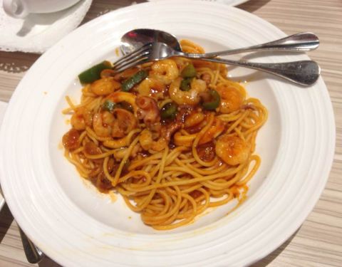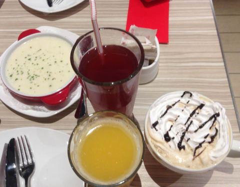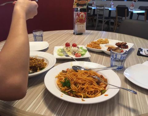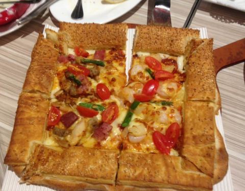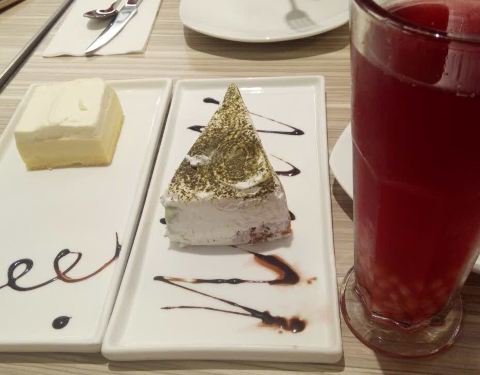 披萨有点咸,饮料不错,抹茶蛋糕好吃,肉串还行就是有点油