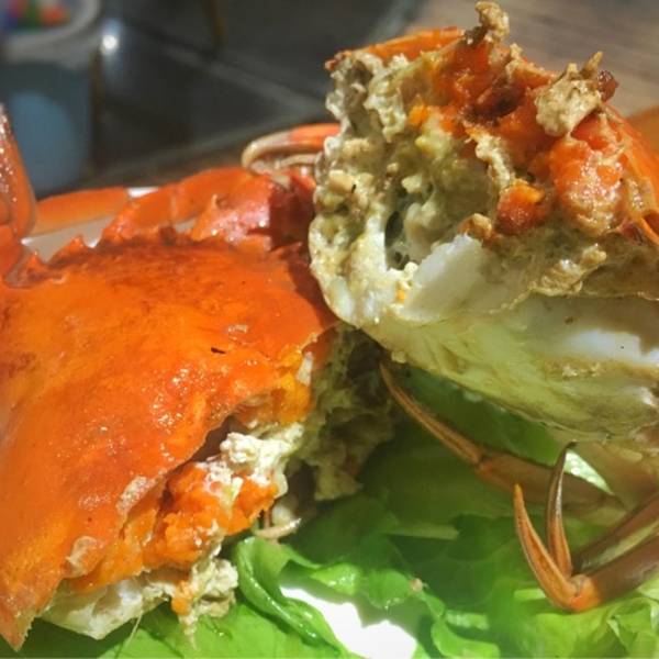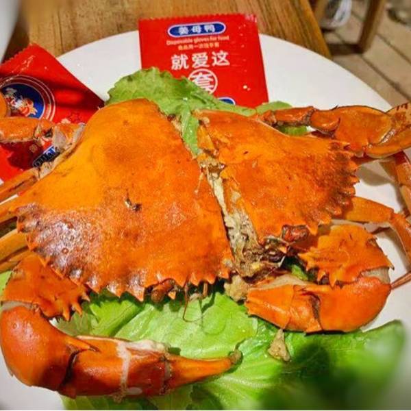 香喷喷热乎乎的螃蟹,切两半,有配手套,可以看到满满的红膏,可见食材的新鲜,吃起来肉质鲜美可口。