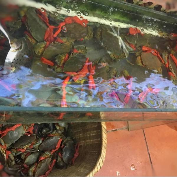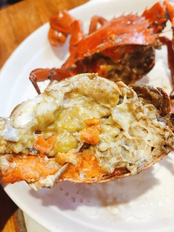 ✨海鲜池内鲜活的膏蟹,现挑现杀,对半切开,佐以姜片垫底,红膏黄膏红黄相间,色香味俱全。蟹壳硬,肉饱满鲜甜,白嫩呈片状,一口咬下去是海洋的味道。
