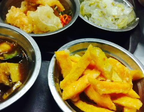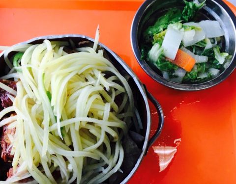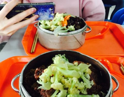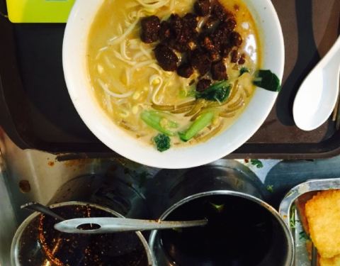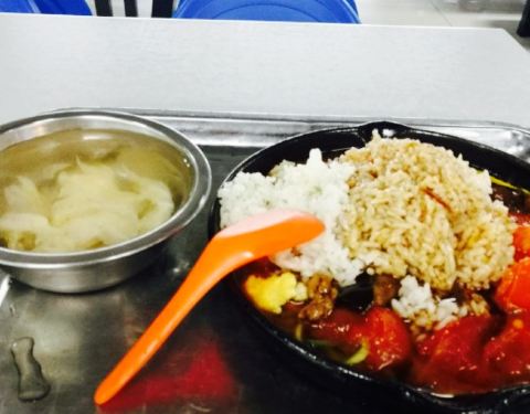 居然学校里的食堂也在美食榜上,简直醉了有木有,嗯,也来网友攻略一下吧。炒菜米饭什么的应该各个食堂都大同小异,门口有免费的汤,嗯,实在是水啊,没有任何其它的东西,诶,也许有盐味精之类的吧。推荐的是铁板,看大家都这么推荐来着,那个队伍好长的说,先去打卡,会给你一个铁盘,然后排队去吧。小哥速度也可以,两个菜拼是六块五。底下的鸡蛋煎的也很鲜美,绝对亮点,不赶时间可以尝试一下。队伍太长。
