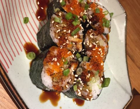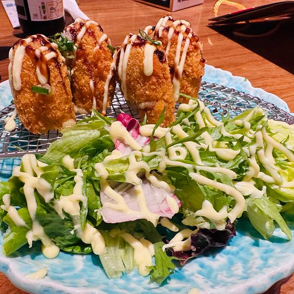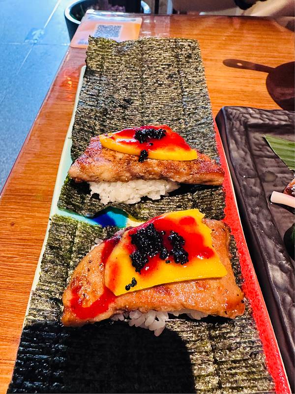 精品刺身三拼是简易版的刺身拼盘,三文鱼🍣北极贝金枪鱼,份量不算多,好吃这口的还是可以点大拼盘;火焰烧牛肉沙拉牛肉片不薄不厚,拌上料汁清爽解腻;鹅肝寿司🍱享受一下自己卷起来制作寿司的过程,鹅肝肥瘦适中,口感不错;鳕鱼酥烧🐟和照烧牛舌比较合口味,看来还是爱吃肉啊;芥末章鱼🐙芥末味刚好,不那么冲,清凉提神;土豆饼🥔略微有些腻,好在有蔬菜🥬沙拉可以搭配;另外打卡还赠送一份招牌寿司,很好吃。