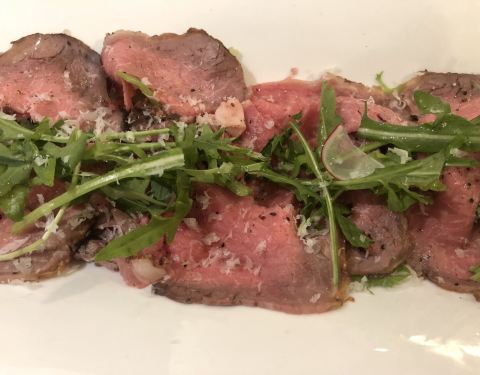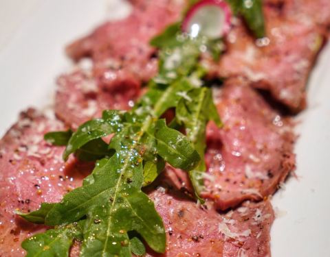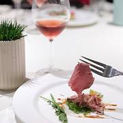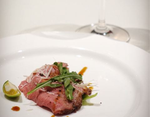 低温慢烤牛肉,沒有华丽的摆盘和鲜美酱汁的搭配,只需清爽的芝麻菜和新鲜的小青桔就使得整道菜锦上添花。