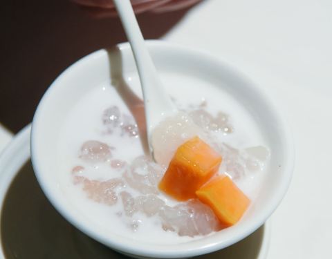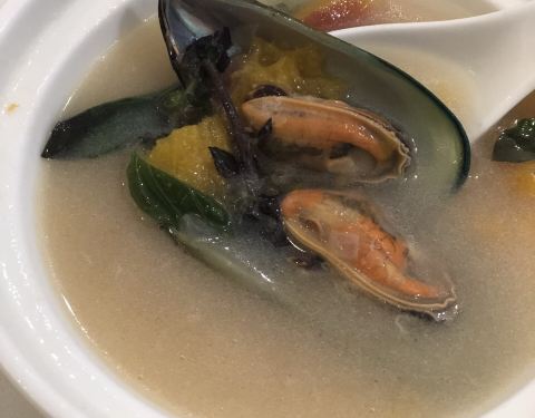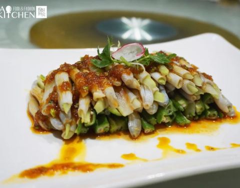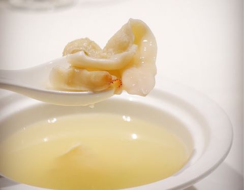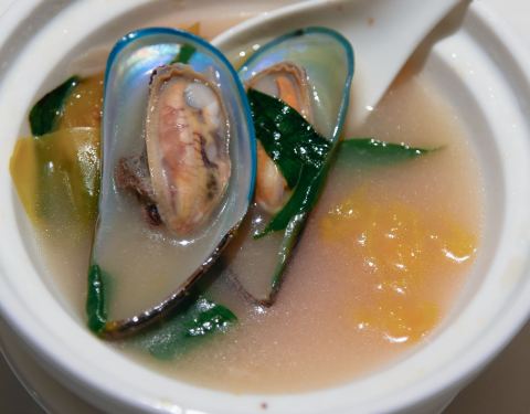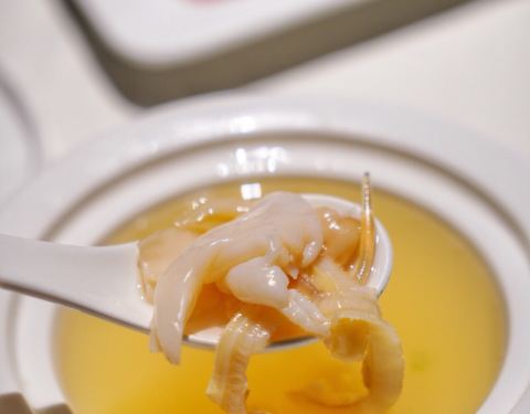 鸡汤汆贵妃蚌,蚌肉洗净用鸡汤汆熟,原汁原味鲜美脆甜的口感让人惊艳