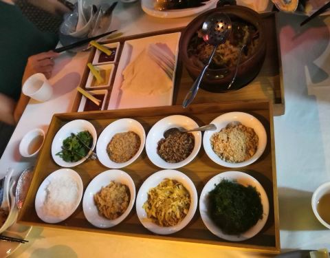 星期一北方的朋友来厦门,接风洗尘,所以选择了黑珍珠餐厅之一的黑明餐厅。餐厅在湖滨南路57号(金源大厦1楼),环境很不错,餐厅那边还有花园,还好有早点定位,因为餐厅人实在多,看来这家很火啊。 朋友许久没吃到闽南菜了,所以特意点了豪华五星薄饼、海蛎煎、闽南紫菜饭,另外还选了两道辣菜一个是冰镇泡椒口味的笋以及川味口水鸡,还有海参汤,芝士焗龙利鱼、黑刺苋炖猪肉汤等一些店里的推荐菜。服务也挺不错的,朋友还是蛮喜欢的。