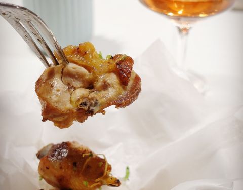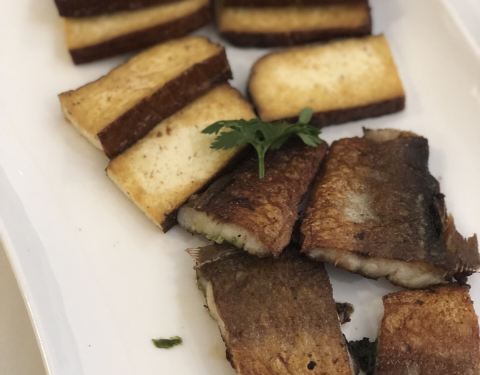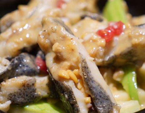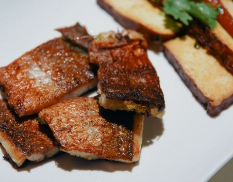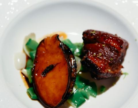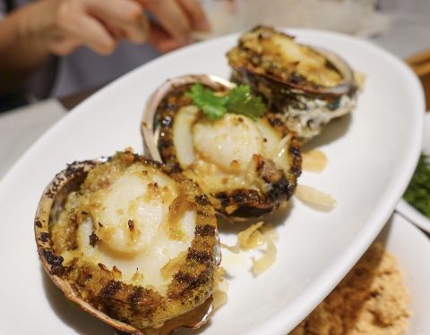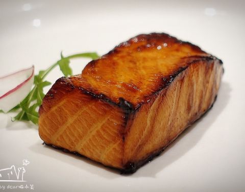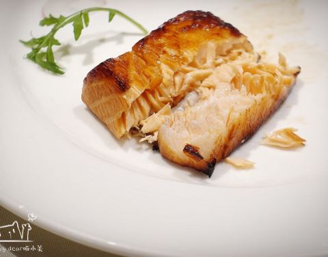 慢熏烤三文鱼腩,三文鱼的狂热爱好者表示这个食材怎么做都好吃,经过烤炙之后鱼肉渗出油脂,鱼皮Q弹,入口就是满满的胶原蛋白。