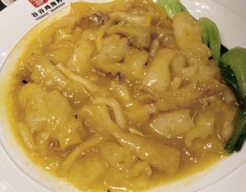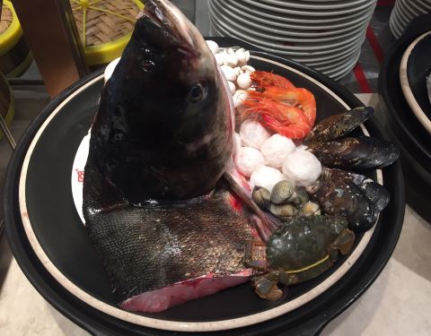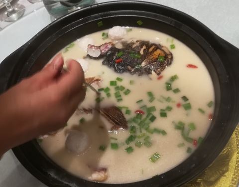 饭店能做到谷谷鸡象山海鲜城(控江店)那样火爆也真是不多,中午11点去很大的一个吃饭区域全部客满。包房更不用提了,据说至少提前二周才能订到。点了一个砂锅天目大鱼头,很大的一个鱼头里面有鱼丸,虾,菌菇,蛤蜊等很多配料,汤很白,很鲜。我们七个人还没有吃完可见这锅汤有多大。味道确实不错的。