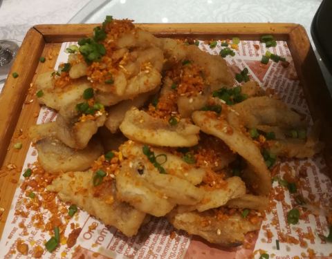 谷谷鸡象山海鲜城控江路店在控江路上,店的门面不是很大,但楼上却别有洞天,特别大,点菜都是看实样点的,我们这次椒盐龙头烤点的失败,不是很脆的,捞汁雪螺片味道不错,脆脆的很鲜,天目山石笋也不错,特别是笋和大虾搭配在一起烧,笋吸取了虾的味道,加上笋自己特有的鲜味,所以这道菜非常鲜美。