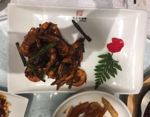 谷谷鸡象山海鲜城生意非常火爆,包房基本要半个月前预定才会有,我们只能去大堂吃了,点了秘制葱烤虾...