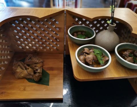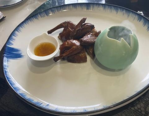 地址在李子坝正街靠江的一面,用餐的时候面朝嘉陵江,那种感觉实在太霸气了。他家主推鸽子宴和烤羊,我们以养生为主,所以挑选了鸽子宴。他家的鸽子宴完全走的是江湖菜的线路,口味比较重,觉得不够精细,算不上宴席的水准。椒麻鸽肉,椒麻多,肉少了一些,本来吃鸽子就是滋补意味更重,不过这家口味有点太重了,深度怀疑这还能起到滋补的作用吗。哈哈。烤乳鸽,这个烤得火候不错,外不焦里还嫩,正是我喜欢的类型。鸽子汤,汤很齁很齁,觉得不是现熬的了,味精的样子更深。可是跟别家不同,他家汤里边的料给得很实。
