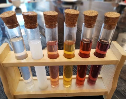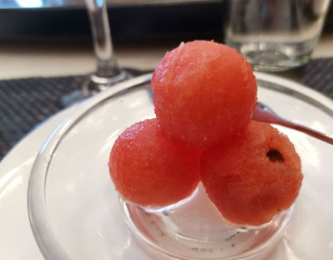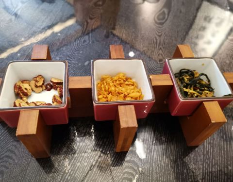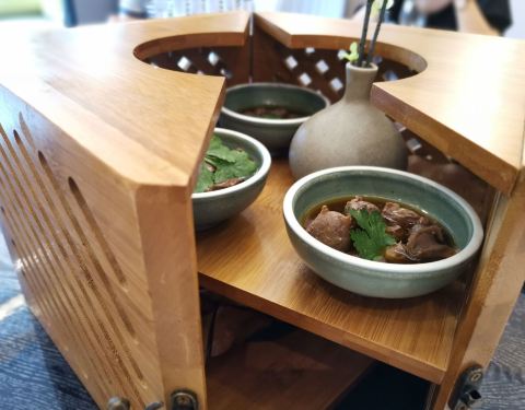 江景私宴又叫“夜宴”,在网红之地李子坝地铁站附近的嘉陵江边,可以看到嘉陵江和江北北滨路景色,位置很幽静。两排平房十几个包间,各有特色,名人字画悬挂屋内,很高雅。饭店主打改良川菜,全鸽烤乳鸽是特色,烤乳鸽很香脆,还有鸽心鸽肝,全部放在一个四方盒子中,很喜欢。还有6中各色果酒放在试管中,有创意,哈哈。