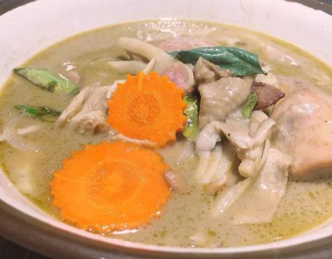 泰式装修风格,菠萝炒饭,用料挺足,菠萝腰果虾仁,颜色好看,口味不算是很惊艳。绿咖喱, 用的都是鸡肉,块大,的确是油咖喱熬煮,辛味比较重,椰浆很浓郁。椰汁西米糕,还行,分成了很小只,西米挺多的。
