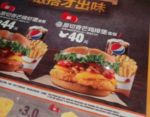 - ...,有挺多家汉堡王的汉堡,王的汉堡,可以说是挺好吃的,然后呢,薯条跟那个霸王鸡条也是挺好吃的东西