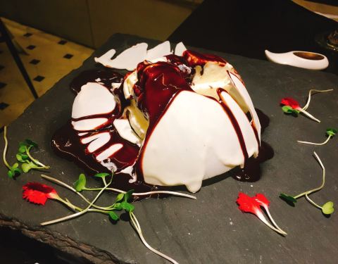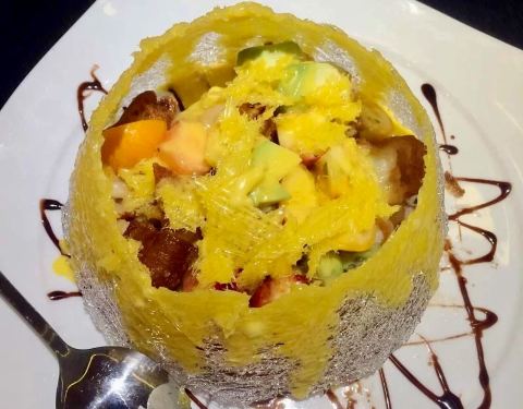 - 名字很美…可以說事實是一道甜品,白巧克力球裡面牛奶小方,配上淋上的巧克力醬牛油果油條蝦,和含苞...