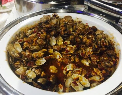 酒店里的环境还不错,有亭台楼阁,流水池塘,树木郁郁葱葱,可办婚礼酒席。岚湾自助餐厅是室外的,桌椅就挨着百家湖边,边吃边赏湖景,微风徐徐,还挺安逸。菜品都放在室内的长桌上,外面架了几个烧烤架。菜的品种都很普通,家常菜居多,口味一般,只能说是果腹的档次。水果主要是西瓜和哈密瓜,西瓜不甜,哈密瓜还不错。烧烤的种类也不多,也就鸡翅,羊肉等,关键烤的技术太一般,鸡翅容易烤糊,味道太咸。团购158的价位主要是吃个环境吧。