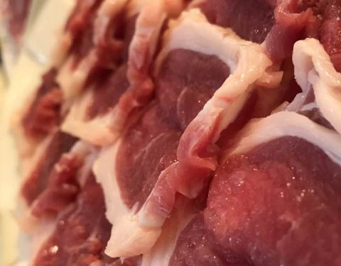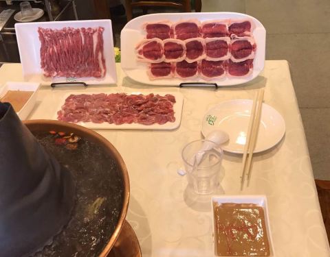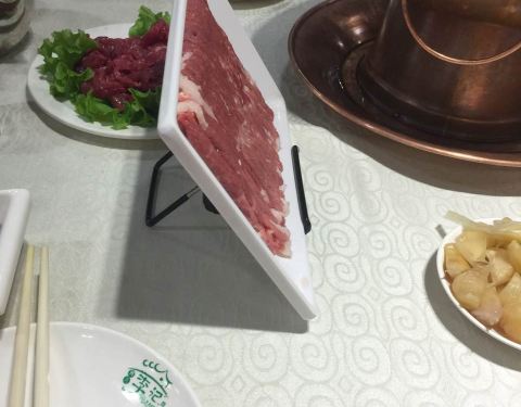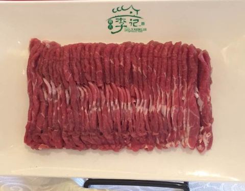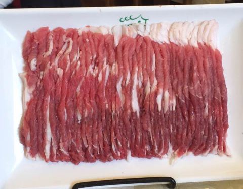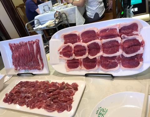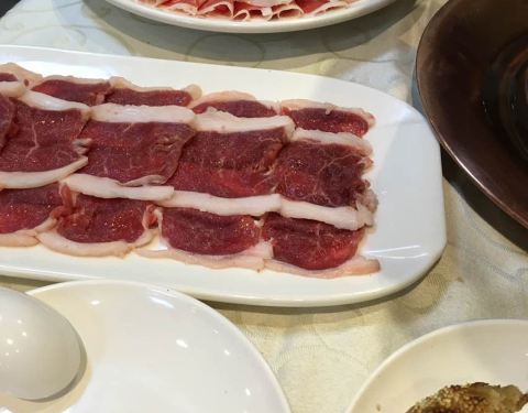 手工现切新鲜羊肉,薄厚均匀、轻烫缩卷。