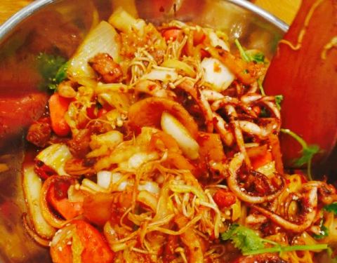 好久没吃干锅了,正好约了同事一起去,这家店之前在观前街吃过很多次,感觉量多又入味,所以决定来这边吃,到店里的时候人不多,随意找了一个位子坐,一开始点了一个大份牛蛙家小份鱿鱼和小份鸡中翅,上去之后就感觉很少,一会就吃完了,之后又点鸡柳还有不少配菜,四个女的也真的蛮能吃的。