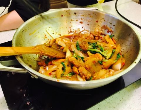 sm叶子干锅,一直想去吃,以前在别的地方吃过,还是很开心的,第一次去这家的时候人满座,排队的人也有一些,拿了号码牌在等,等了一会,好不容易到我们了,结果是那张很小的台子,想想就还是没吃了,想着下次来舒舒服服的吃一顿。今天看里面人没那么多,就进来吃了,两个人,查询了服务员两个人的量,点的菜中途服务员会过来帮我们炒,最终吃的很饱,味道还是很美味,也很实惠。提个建议,就是服务员在炒的时候给个餐巾布让顾客挡一下或者提供围裙,因为还是有一点点会溅出来,以防万一,但是本人建议。
