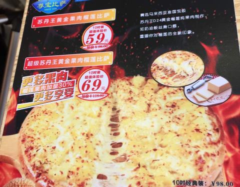 - 披萨是俺的最爱,楼下这家尊宝的榴莲口味越做越棒!环境干净,服务态度和善,人很少,大家都点外卖了