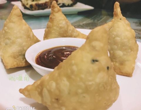 #肉圆食记# 「金叉子印度风情餐厅」地址:气象台路7号(电台道口)。在天津很有名的一家以主打多种多样调料而闻名的印度餐厅,由店内多半是外国友人的客人可见其正宗程度。店内布置得很有异域风格,是下沉式地下楼梯。 咖喱角金黄酥脆,馅料很惊喜,烤饼拼盘有多种口味可供选择,芝士的味道很浓郁,招牌印度奶茶,口感香甜,有提神的功效。