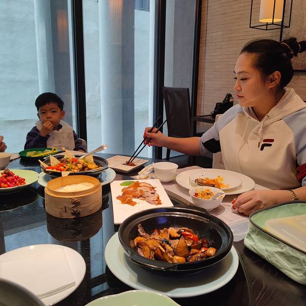 春节出行是给家人的新年惊喜,临行前都比较兴奋,走的也比较早。借着这个机会,正好中午可以打卡汉碧楼的水沙涟中餐厅了。水沙涟中餐厅是青岛饕客们必来打卡之地,民国菜融合各地知名菜系,如同是味觉上的文化飨宴。 提前定了他家的四人餐,前台经理帮忙预留了一个环境很舒适的小包间,用餐感受很优雅闲适。午餐共计12道餐品。 两个凉菜、一份点心、一份餐后水果,八个热菜。 分量很足,有一道太汤菇笋煮黄鱼高汤吊的很入味,做法非常新颖,汤汁鲜美。汉碧楼的服务不得不说非常到位,因为带着小朋友不能吃辣,所以经过后厨反复确认过,将原定偏辣口的阳春面换成了高汤面,里面还多加了青菜。店里特意少放了调料,去了味精,兜爷吃得很开心,所有的菜品他基本都可以使用,而且口感清淡,入口如沐春风。2022年的第一张全家福