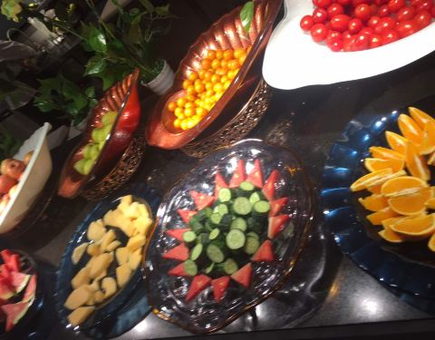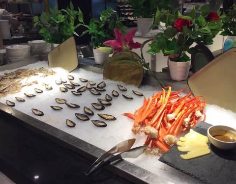 环境很好,去的早,食物种类很多,水果蔬菜很新鲜,烤涮用的海鲜也比较新鲜,海鲜主要是虾,扇贝和蟹脚,种类少点。火锅涮料有很多蔬菜,腌制肉类。中式西式的小点心都非常好吃,服务态度很好。