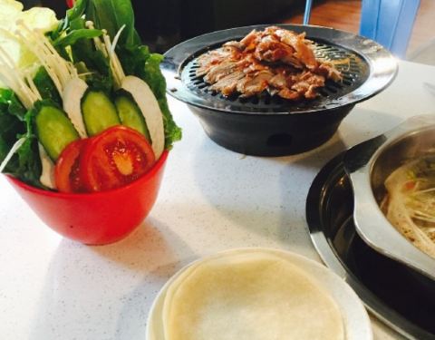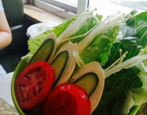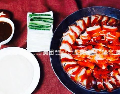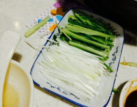 两个人团购的套餐,烤鸭是主餐,烤得还算不错,鸭皮比较脆,甜酱咸甜适中,饼皮也比较筋道,加上些黄瓜丝葱丝,吃起来口感不错。除了烤鸭,还有一盘蔬菜供烫着吃,一碟凉拌黄瓜和酸萝卜鸭汤。蔬菜比较清新,但觉...