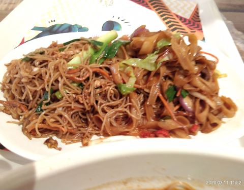 万象城楼上的美食城 第二次来 这次发现了好吃的呢 休息日中午 就餐的人儿很多 先点餐再找位置 直接二维码可以付款 真方便 不像以前还要充值退卡的怪麻烦 有家广式口味的店铺毕竟吸引我 干炒牛河 拌米粉 都很想吃 可以双拼 都吃吃 拌点辣酱 更有味道